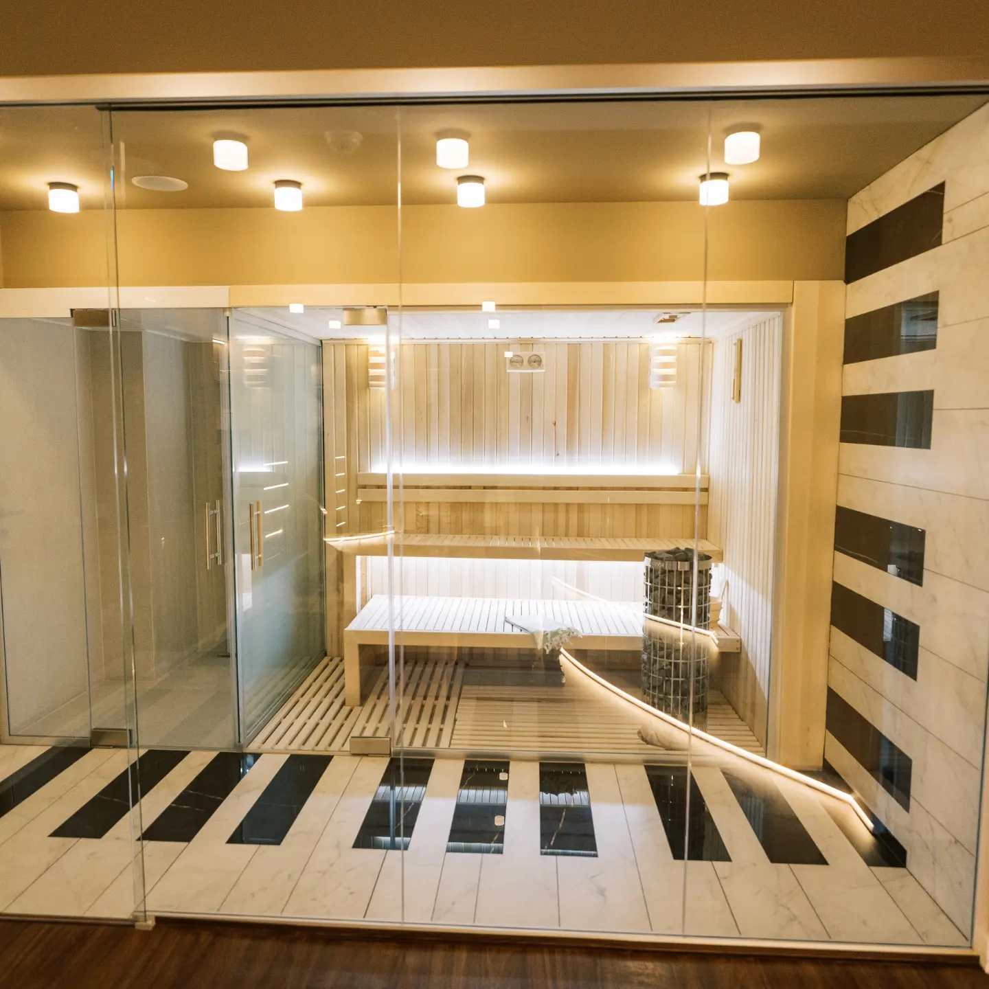 hammam si fantana de ghiata, o zona de relaxare, piscina interioara si jacuzzi exterior si un